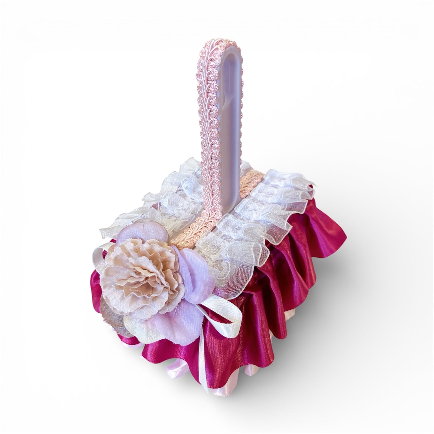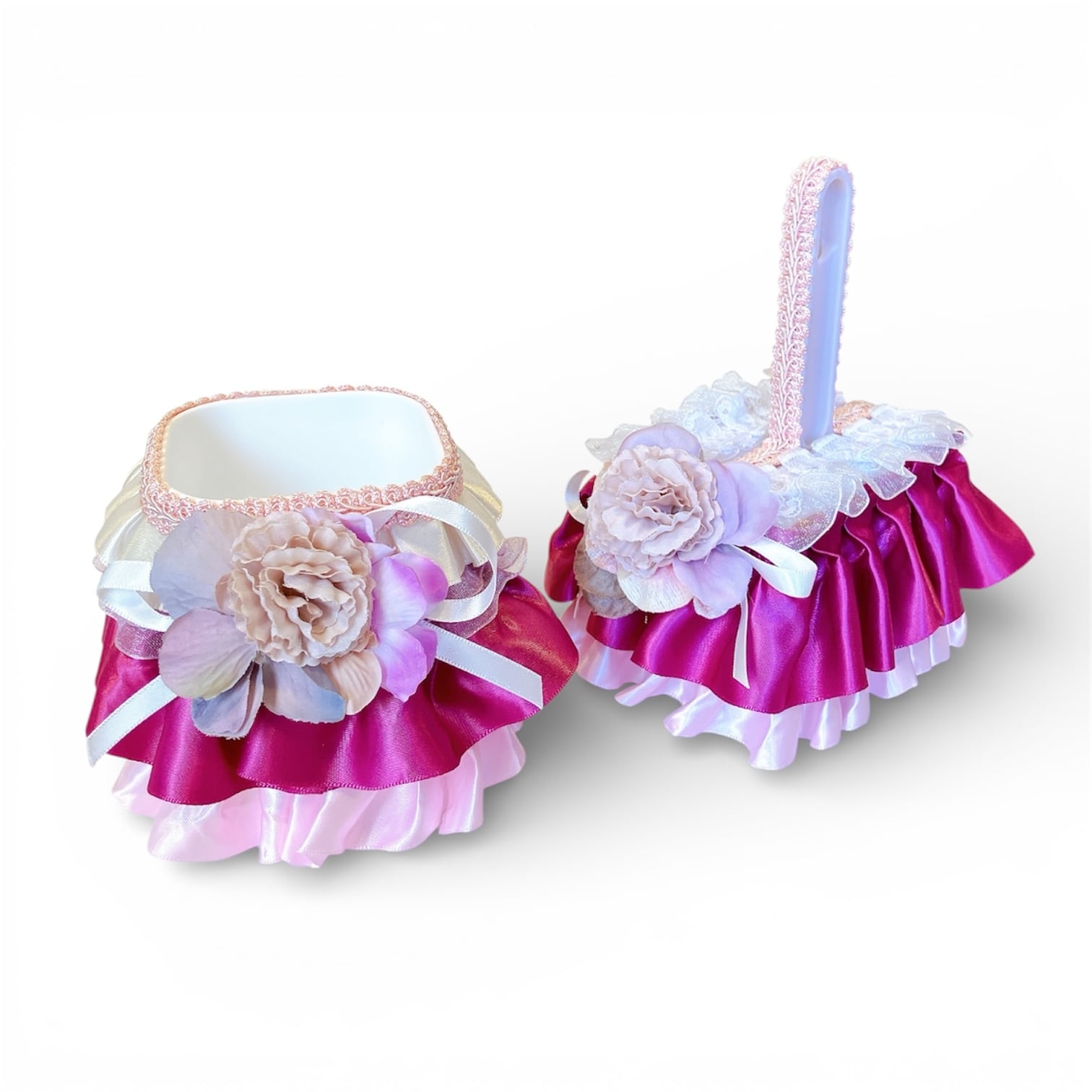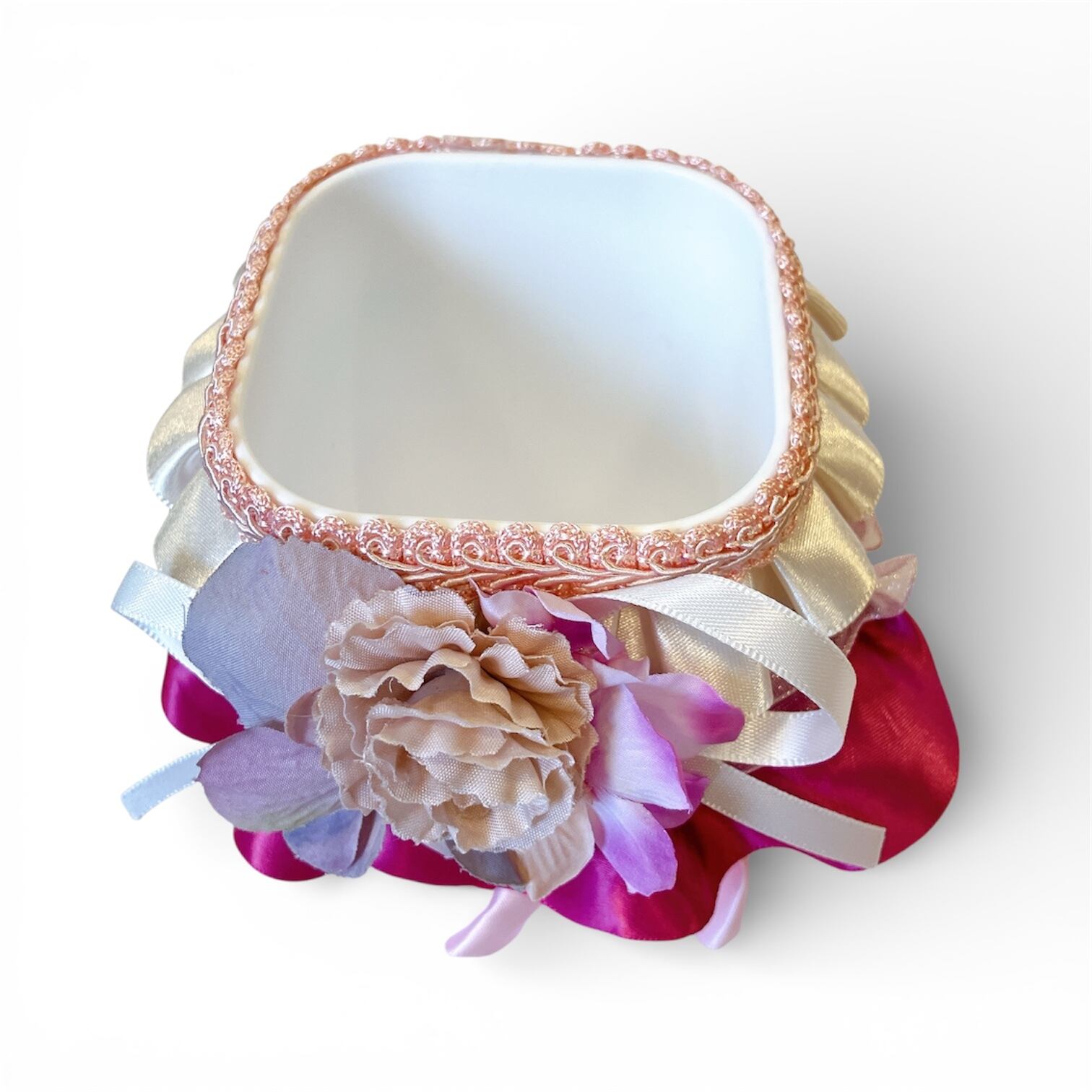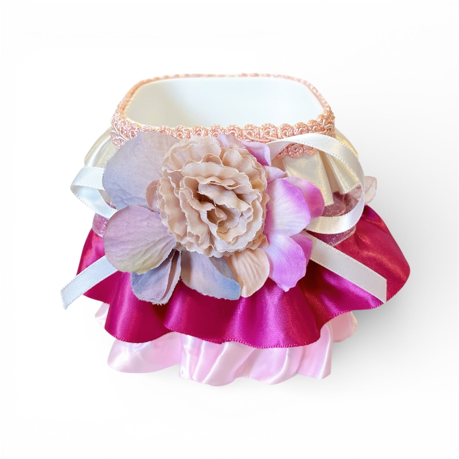 お花やリボン、フリル、レース等をふんだんに使用したボリューム感のある小物入れに仕上がりました